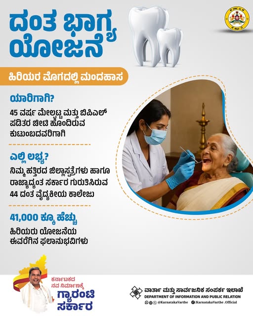 45 ವರ್ಷ ಮೇಲ್ಪಟ್ಟ ಮತ್ತು ಬಿಪಿಎಲ್‌ ಪಡಿತರ ಚೀಟಿ ಹೊಂದಿರುವ ಕುಟುಂಬದವರು, ನಿಮ್ಮ ಹತ್ತಿರದ ಜಿಲ್ಲಾಸ್ಪತ್ರೆಗಳು ಹಾಗೂ ರಾಜ್ಯಾದ್ಯಂತ ಸರ್ಕಾರ ಗುರುತಿಸಿರುವ 44 ದಂತ ವೈದ್ಯಕೀಯ ಕಾಲೇಜುಗಳಲ್ಲಿ ಈ ಸೌಲಭ್ಯವನ್ನು ಪಡೆಯಬಹುದು. ಇದನ್ನೂ ಓದಿ : ಶಾಲಾ ವಿದ್ಯಾರ್ಥಿಗಳಿಗೆ ನೀಡಿರುವ ಬಸ್‌ ಪಾಸ್‌ ಅವಧಿಯನ್ನು ಏಪ್ರಿಲ್‌ 10ರ ವರೆಗೆ ವಿಸ್ತರಣೆ