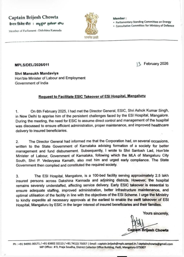 ಮಂಗಳೂರಿನ ESI ಆಸ್ಪತ್ರೆಯಲ್ಲಿ ಎದುರಾಗುತ್ತಿರುವ ಸಮಸ್ಯೆ -ಸವಾಲುಗಳ ಕುರಿತು ಹಾಗೂ ದಕ್ಷಿಣ ಕನ್ನಡ ಮತ್ತು ಸುತ್ತಮುತ್ತಲಿನ ಜಿಲ್ಲೆಗಳ ಸುಮಾರು 2.5 ಲಕ್ಷ ವಿಮಾದಾರರಿಗೆ ಸೇವೆ ನೀಡುತ್ತಿರುವ ಈ 100 ಹಾಸಿಗೆಗಳ ಆಸ್ಪತ್ರೆಯನ್ನು, ESIC ಸಂಸ್ಥೆಯು ನೇರವಾಗಿ ತನ್ನ ಸುಪರ್ದಿಗೆ ತೆಗೆದುಕೊಳ್ಳುವ ತುರ್ತು ಅಗತ್ಯದ ಬಗ್ಗೆ ಪ್ರಮುಖವಾಗಿ ಈ ವೇಳೆ ಕೇಂದ್ರ ಸಚಿವರಿಗೆ ಮನವರಿಕೆ ಮಾಡಿದರು. ಇದನ್ನೂ ಓದಿ : ಅಮೆರಿಕದ ಸಿಯಾಟಲ್ ನಗರದಲ್ಲಿ ನಡೆದಿದ್ದ ಕಾರು ಅಪಘಾತ – ಸಾವಿಗೀಡಾಗಿದ್ದ ಭಾರತದ ವಿದ್ಯಾರ್ಥಿನಿ ಕುಟುಂಬಕ್ಕೆ 260 ಕೋಟಿ ಪರಿಹಾರ